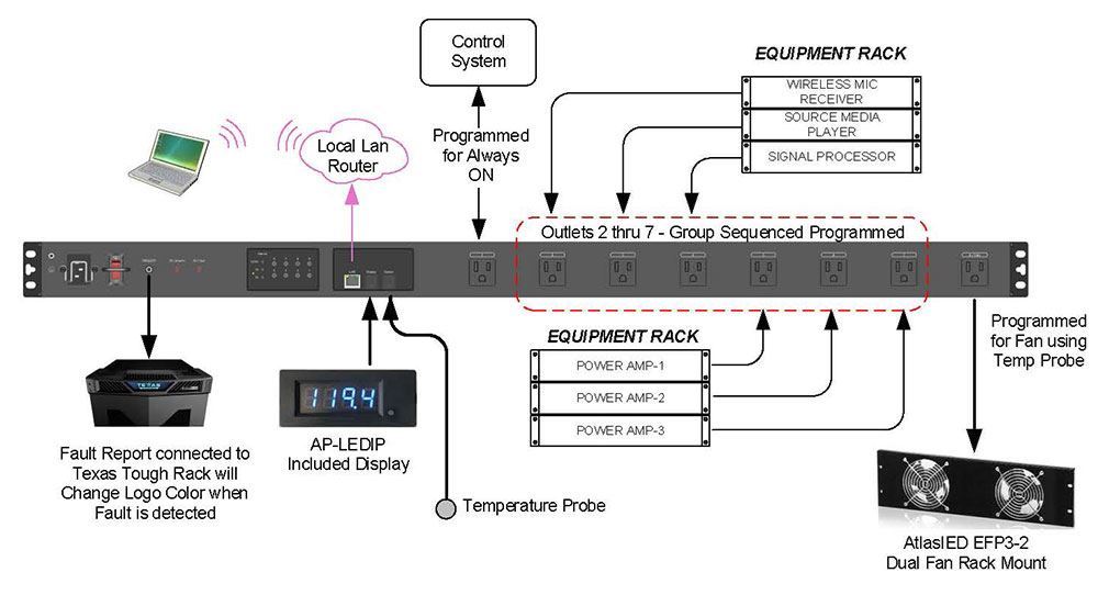 The AP-S158IP utilizes PC based IP discovery software to automatically identify units connected to the network. An LED display, AtlasIED model AP-LEDIP, is included to provide a visual reference of the voltage, current, temperature or humidly data within the rack in real time. The AP-LEDIP can also be used to read the IP address of the unit eliminating the need to use the discovery software. The external temperature/humidity probe can be used to monitor rack climate conditions to activate a cooling system if needed. Programable alarm settings are easily configured with fault logs and fault reporting via the UI. The unit or individual outlets can be tested or monitored for active status via the Auto Ping Reset feature.