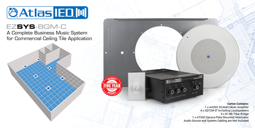 The EZSYS-BGM-C package is an entire business music and paging system. It includes the proper amplification, system control, and speakers. All you need are audio sources and cables. The box illustrates the proper way to connect the equipment including cable and tool requirements