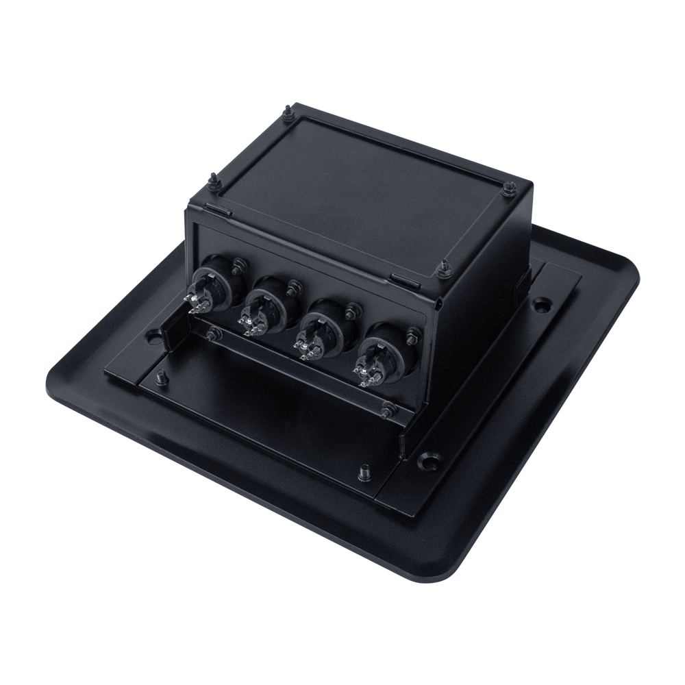 AtlasIED FB4-XLRF floor box assembly provides a simple solution for recessed mic inputs. The unit is designed for easy installation into wood stages and platforms. (4) Female XLR connectors are recessed and slant loaded into the enclosure. A hinged steel cover plate provides protection for cable connectors. Connectors are standard "D sub" type and may be easily removed to allow substitution of other "D sub" devices.
