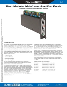 The IEDT6602L is a class D, dual channel, 1200W Total, 70V power amplifier card used in the Titan T9160 multi-channel mainframe or in the IED T6400 two-card power amplifier mainframe. Any card may be placed in any slot in the mainframes without requiring any configuration settings to be made on the amplifier cards.