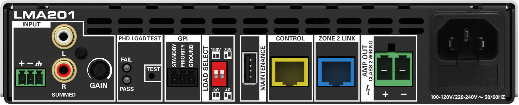 Integrator-focused features include balanced line inputs, electronically summed RCA jacks, rear-panel detented gain control, and remote level control support. When linked to a DMA amplifier via standard Ethernet, the LMA201 becomes a gain-matched Zone 2 or expansion channel with centralized control. Push Here Diagnostic (PHD) simplifies commissioning by verifying speaker wiring, impedance, and tap settings automatically.