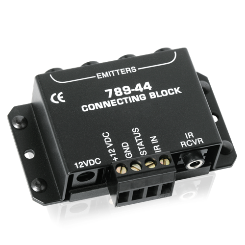 For installation flexibility, the M-1CB4B amplified connector block is offered as a plugin interface device that provides connections for an M-1A Series repeater, four F-1 flashers, and power supply Model PS-M12. This configuration allows IR operation of up to four A/V components from up to four room locations. The M-1CB4B offers 1/8’ mini jacks for power supply Model PS-M12 and up to four F-1 flashers; it also provides terminals for wiring up to four M-1A repeaters (rooms) in parallel fashion. The units amplified circuit design supplies clear, strong IR data to source components.