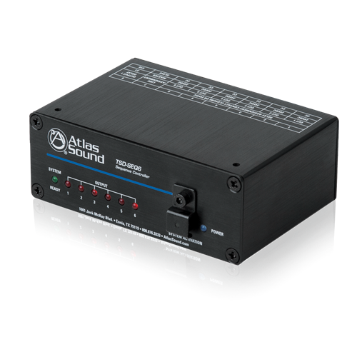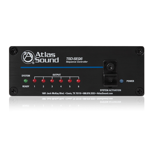 The AtlasIED TSD-SEQ6 Sequencer Controller features 6 outputs that are configurable individually to be either a 24VDC output or Hard Switch Contact Closure (CC). There are two separate output sequence time delay trimmers ranging from 1 second to 10 minutes. Activation can be done via the front panel or remotely via Hard Switch CC, Momentary Switch or DC Voltage. The TSD-SEQ6 also incorporates an Emergency Power Down (EPD) port for local fire codes. You can link two TSD-SEQ6 units together giving you 12 sequenced outputs.
