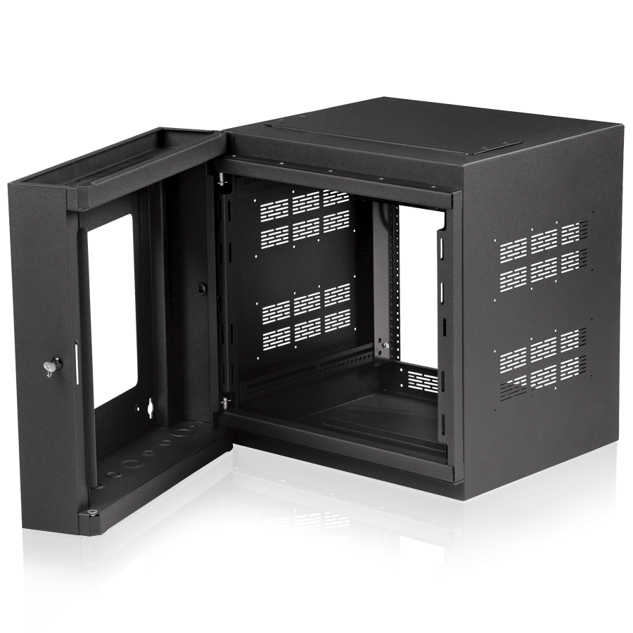 The WMA Series wall cabinets are 16-gauge, welded with 18" deep center-section and adjustable mounting rails, and a 4 1⁄2" deep rear section. Panel space openings range from 10 RU to 35 RU. Cabinets are equipped with provisions for custom cabinet mounting, wire management, equipment mounting, and structural support.